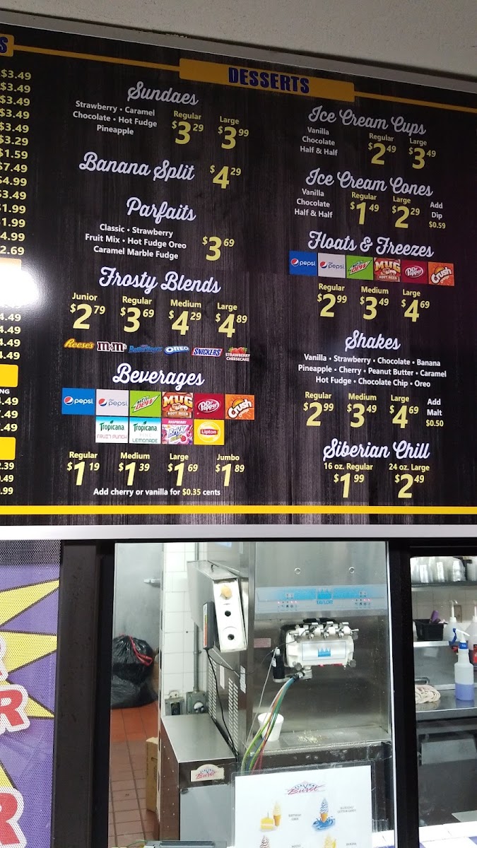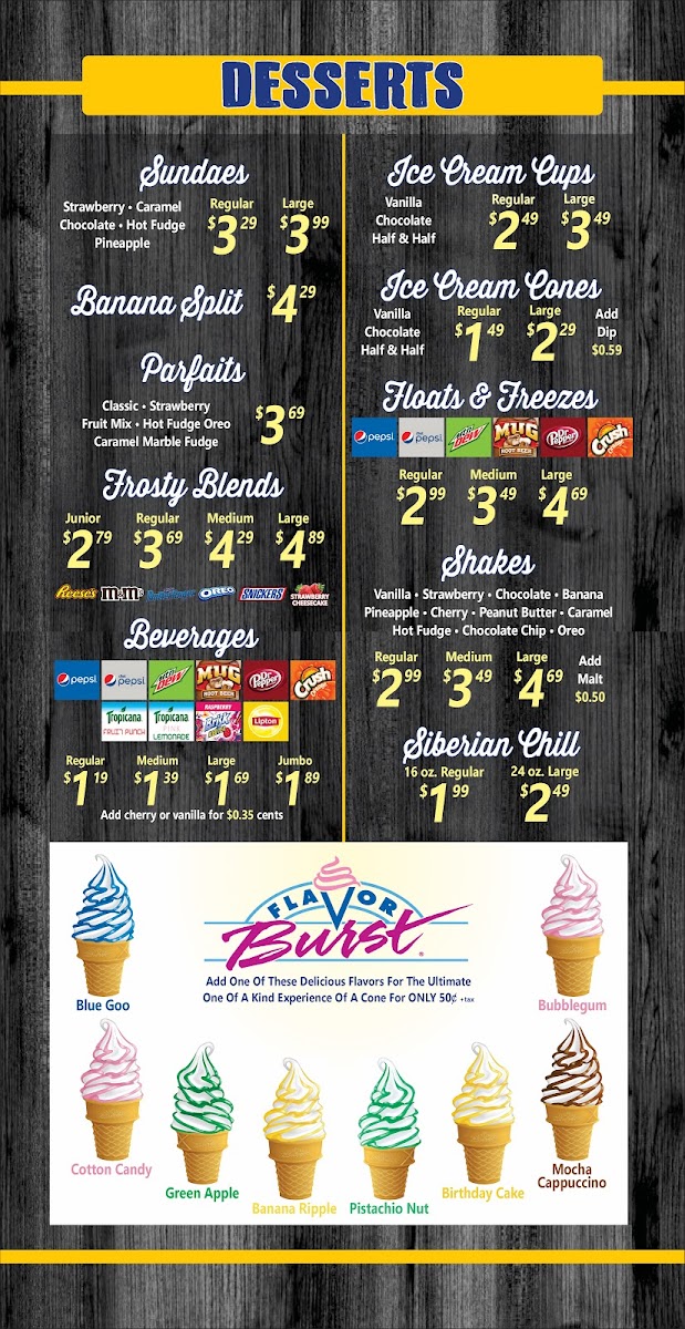 Creamy ice cream swirled into your choice of soda: Pepsi, Diet Pepsi, Dr. Pepper, Orange Crush, Sierra Mist, Mountain Dew, Mug Root Beer, Pink Lemonade, or Fruit Punch.