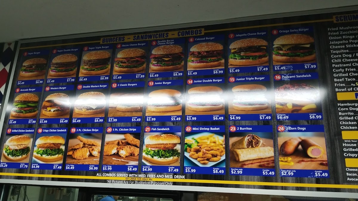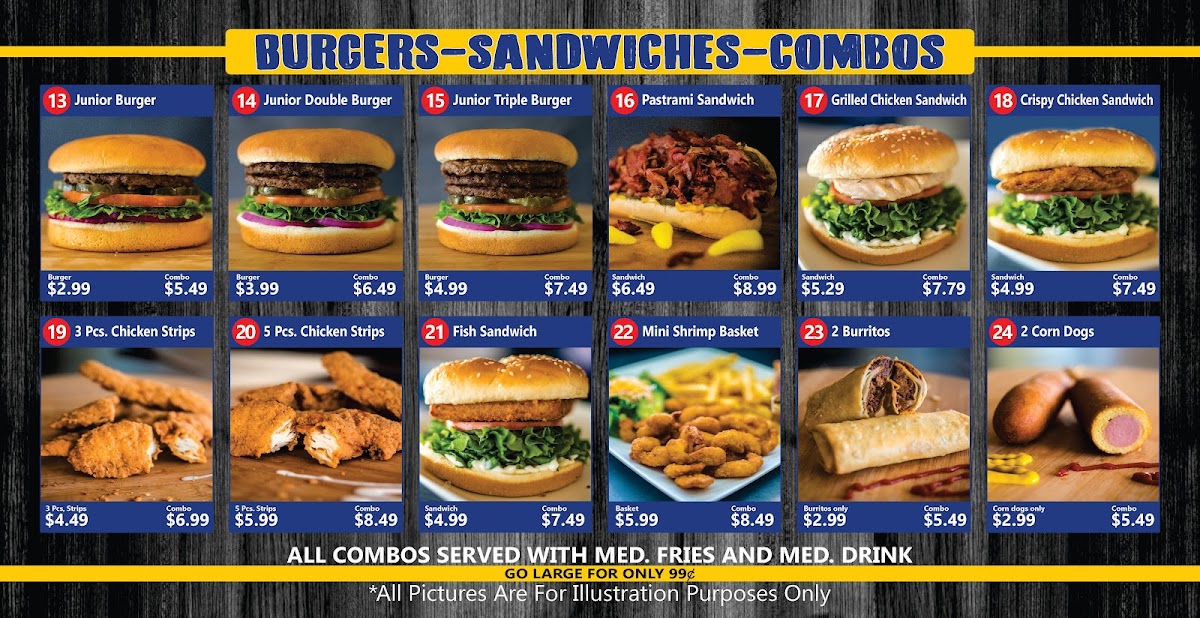 Comes with quarter pound patty, 1000 Island, pickles, lettuce, tomatoes, and onions topped with our juicy pastrami all between two fresh sesame seed buns. Medium fries and a medium drink.
